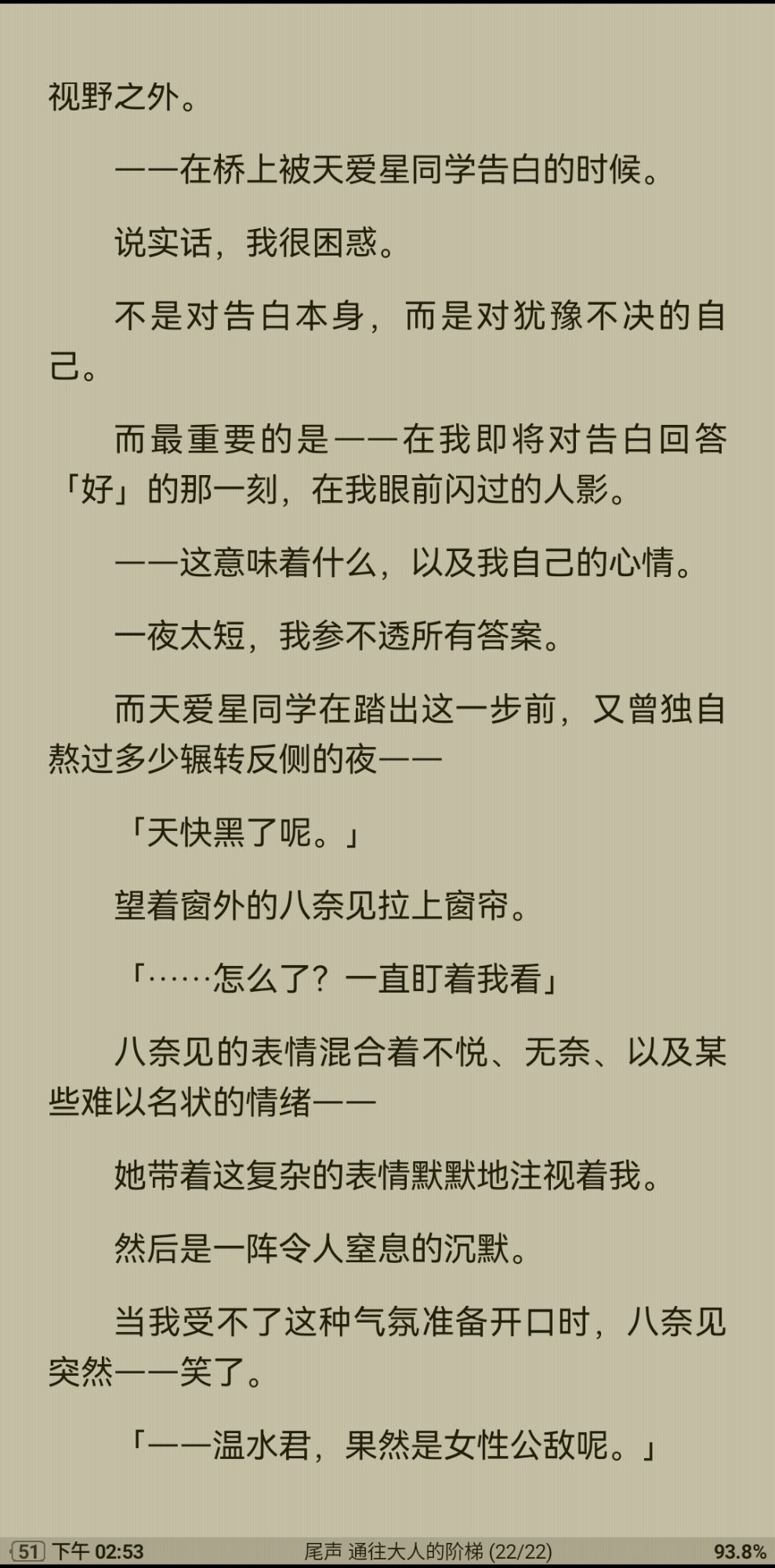 此处老八的表情,不知在动画里会如何表现。我觉得:不悦,是因为温水明显没说实话;无奈,是因为她知道温水就是会像这一卷一样忍不住去帮忙,然后和别的女生搞近关系;难以名状的情绪,大概就是喜欢吧。但到最后她又确实能感觉到温水目前仍然是最在意她的,所以笑了。这一卷,老八没有气急败坏,虽然看上去没怎么防守,但确实也成熟了不少(比如把白玉送进了学生会)。